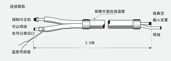 連接管路,連接管路是由兩根銅管和保溫材料組成,兩端均可以焊接也可做成活口,長度可以根據(jù)用戶需求制作,由于管路本身要作為熱負載來考慮,所以當管路長度超過4m時,則應選擇大一些的產(chǎn)品。