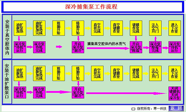 工作流程圖:改圖詳細介紹了深冷捕集泵跟真空鍍膜機配合使用時,深冷泵開關機時間,開啟制冷的時間和開啟除霜的時間,以便發(fā)揮捕集泵最佳性能。